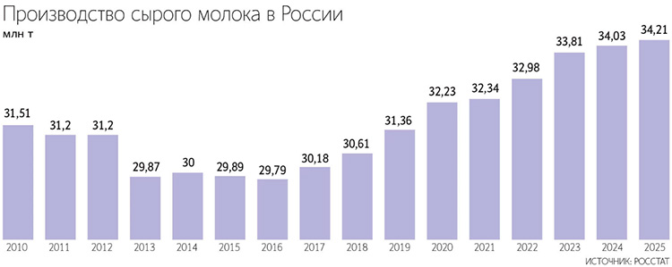 Производство сырого молока в России в 2025 г. достигло максимума за 30 лет и составило 34,3 млн т, сообщил вице-премьер РФ Дмитрий Патрушев. Такие данные он привел на XVII съезде Национального союза производителей молока (Союзмолоко) в конце января. По сравнению с показателем 2024 г. производство выросло примерно на 1%.